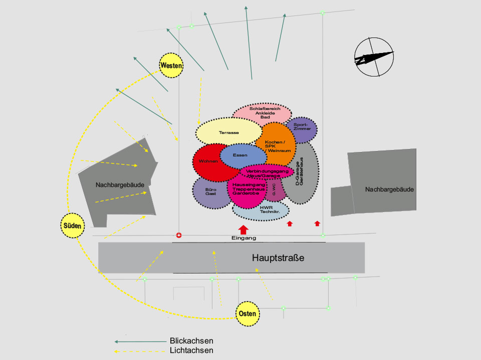 Mit Beginn der Planungsphase analysieren wir zunächst die spezifischen Gegebenheiten Ihrer Grundstückslage (1-8), um eine standortgerechte Lösung zu entwickeln (siehe Graphik). Darauf aufbauend erfassen wir Ihr Raumprogramm detailliert, um Ihre spezifischen Bedürfnisse und Anforderungen zu verstehen. Anschließend definieren wir gemeinsam die Anzahl, Größe und Funktion der Räume, um eine optimale, effiziente Nutzung und Gestaltung Ihres Wohnraums zu gewährleisten.