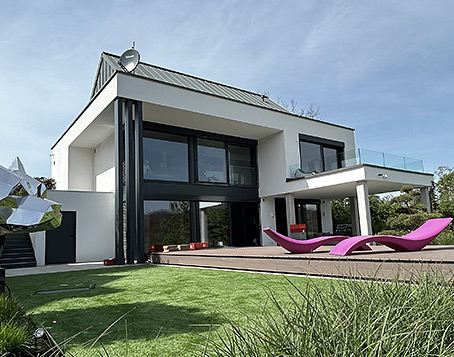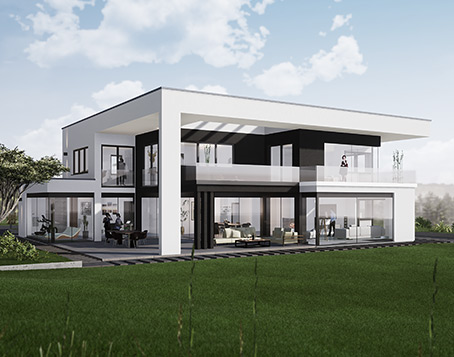 Das Wohnhaus übersetzt klassische Bauvorschriften in eine moderne Architektursprache. Der Wunsch der Bauherren war ein Haus nach den Prinzipien des Bauhausstils - klare Geometrien, großzügige Verglasungen und eine starke Verbindung zur Landschaft.